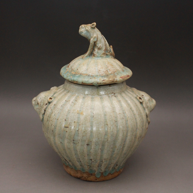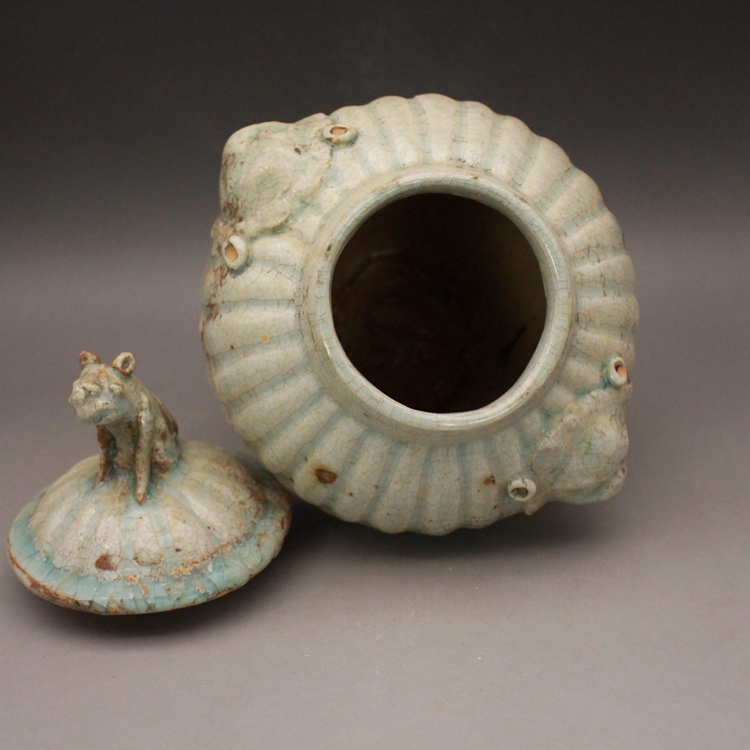 Northern Song Dynasty Longquan kiln grey blue glaze carved pattern dog head lid jar Antique antique ceramic collection antique porcelain ornament