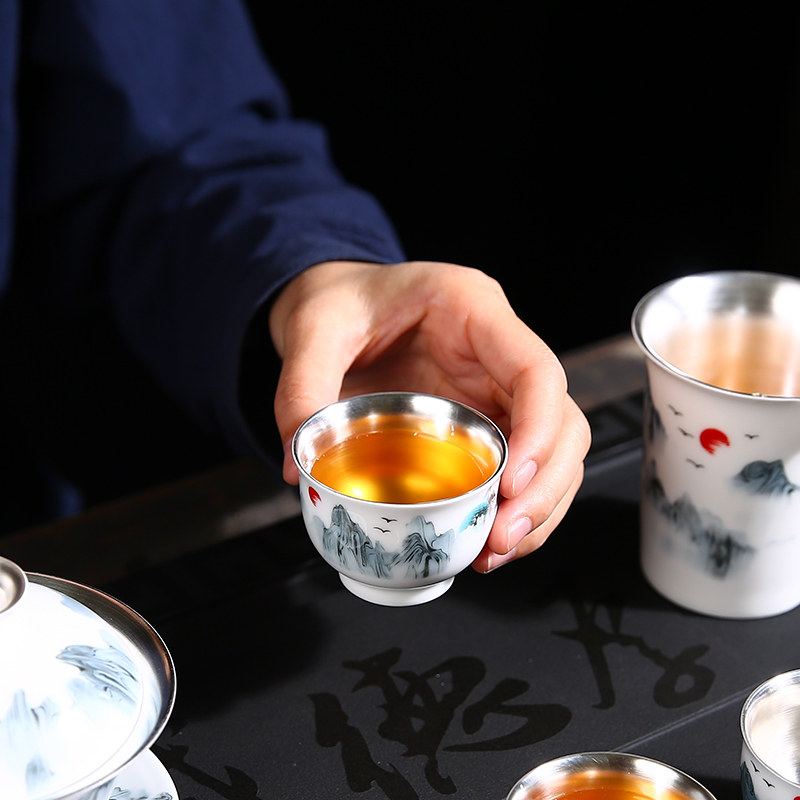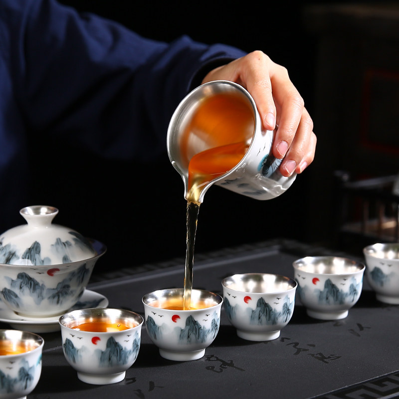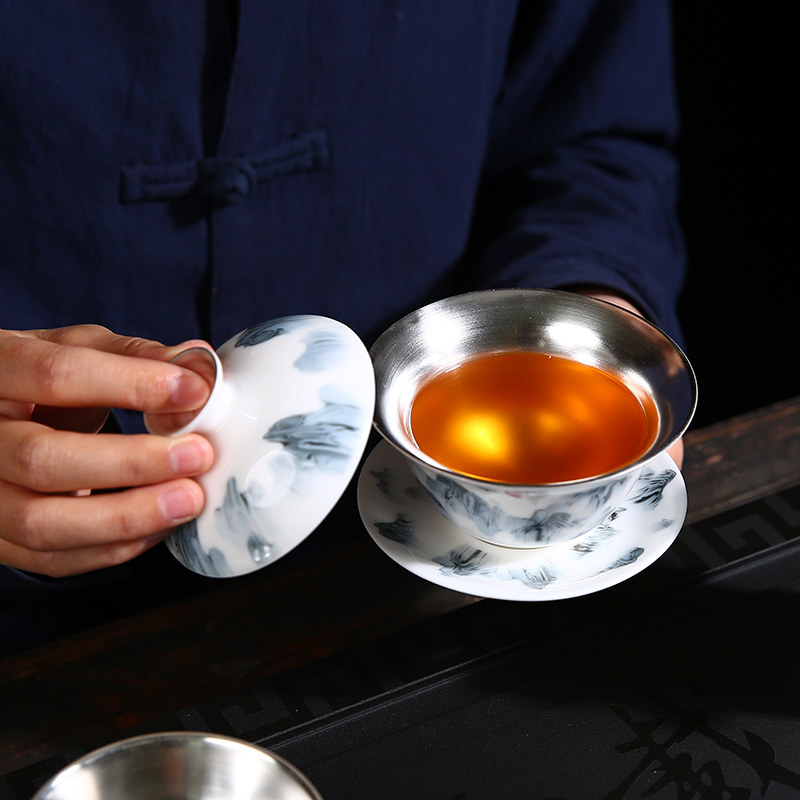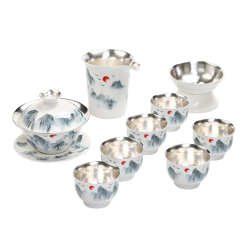 999 Sterling Silver Whole Set Kung Fu Tea Set Kung Fu Tea Set Kung Fu Tea Set Home Ceramic Lid Bowl Tea Cup