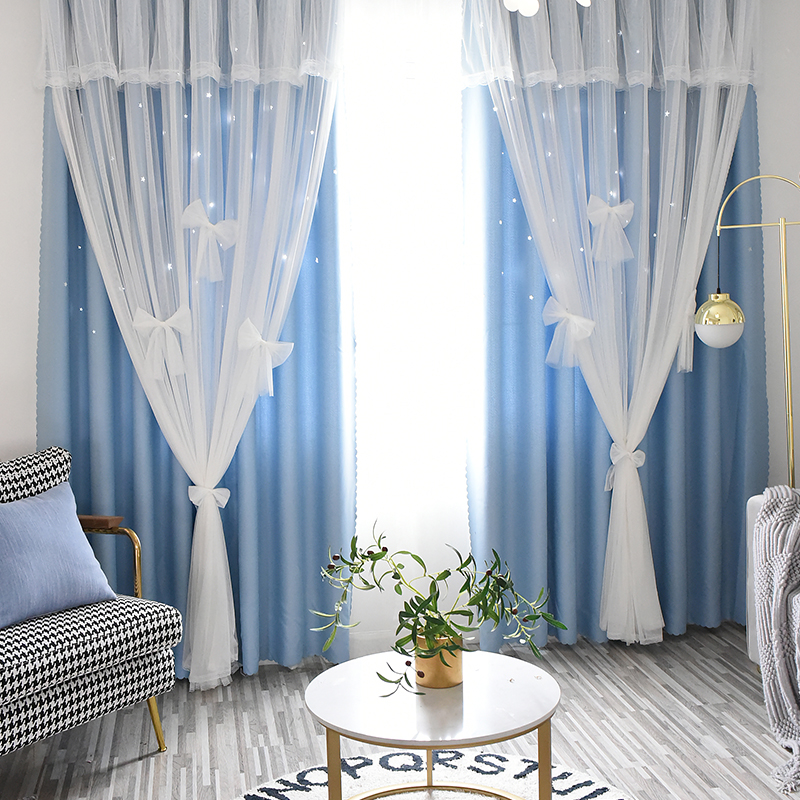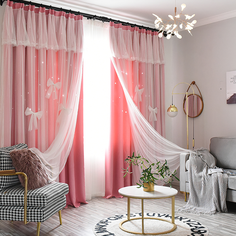 Cloth and gauze integrated curtain hollow star double layer with gauze net red princess bedroom living room bay window blackout custom curtain