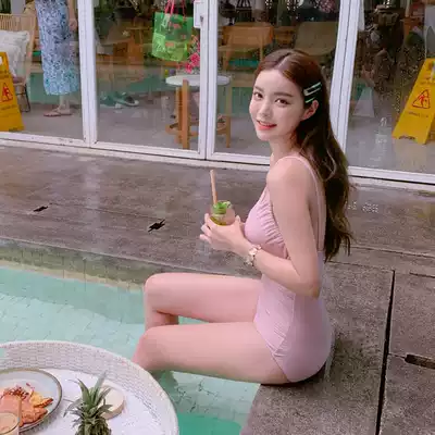 Pink V-neck cross backless sexy bikini gather Conservative belly thin cute one-piece swimsuit hot spring
