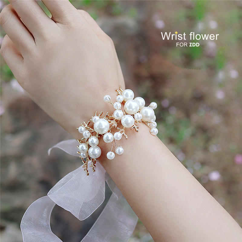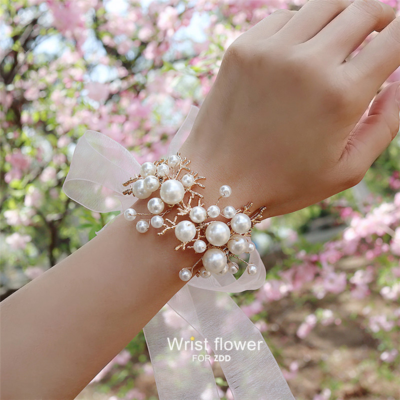 Bridesmaid's wrist flower bridal sister group hand ring flower dance performance handmade pearl wedding European-style golden baroque