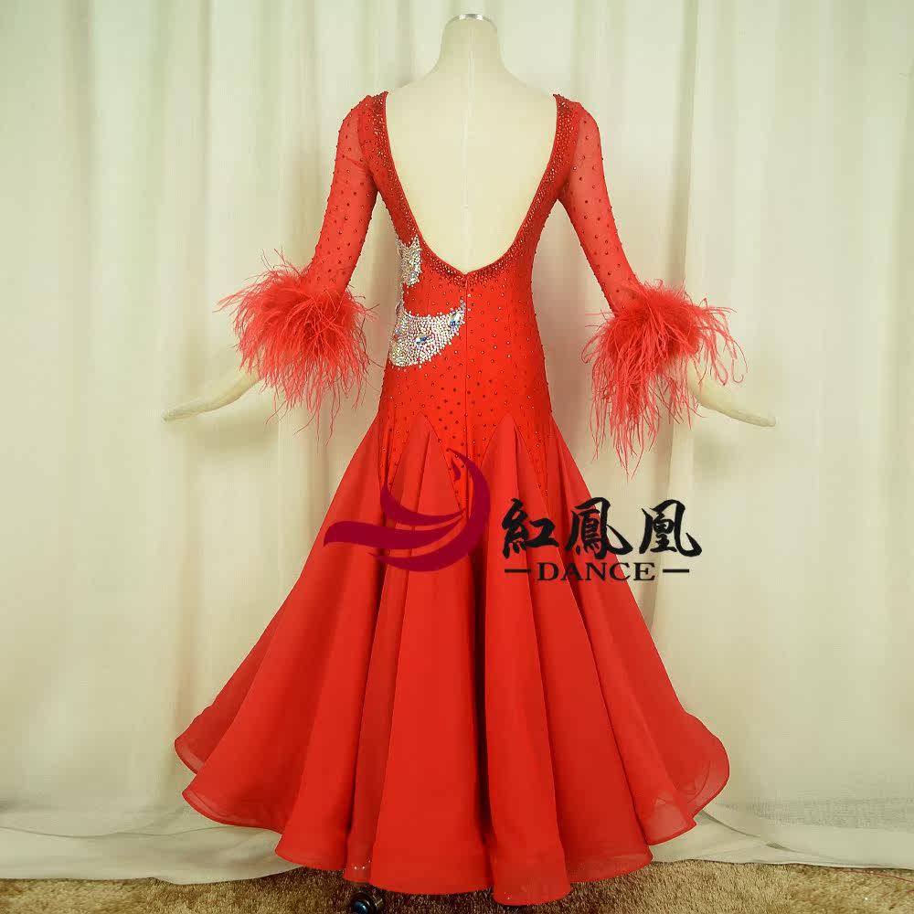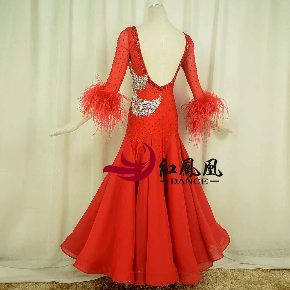 Red Phoenix Ostrich Wool's Morden Dance Contest Professional Competition Dress Out of the National Label Dancing Big Pendulum Skirt BR859
