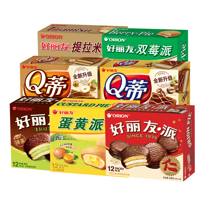 408g Chocolate Pie (red box) 420g light snow Strawberry pie 432g Smear Tea Pie 336g Moka Taste Q Ti 336g Hazelnut Taste Q Ti 336g Red Velvet Berries Cranberry Q Ti 27