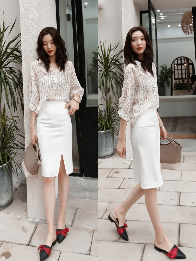 Europe station skirt women's 2021 new high-rise slim slim split step skirt mid-length white hip skirt