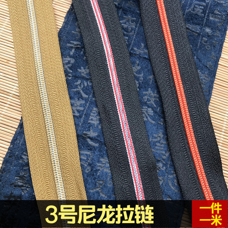 No. 3 Nylon zipper 3 Nylon zipper Black Teeth Black Line 3 Nylon zipper 3 Silver tooth yellow cloth with no. 5 Nylon zipper Gold and tooth cloth with no. 5 Nylon zipper gold teeth black