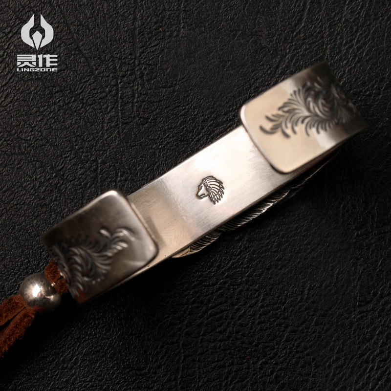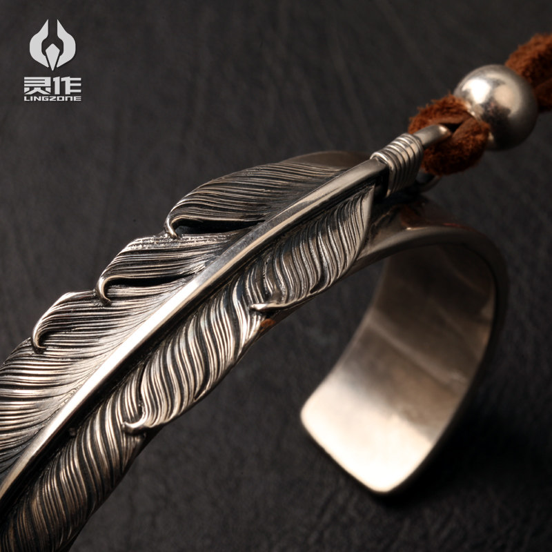 Lingzuo silver sterling silver feather flat playing Tang grass bracelet handmade with rope personality vintage custom lettering