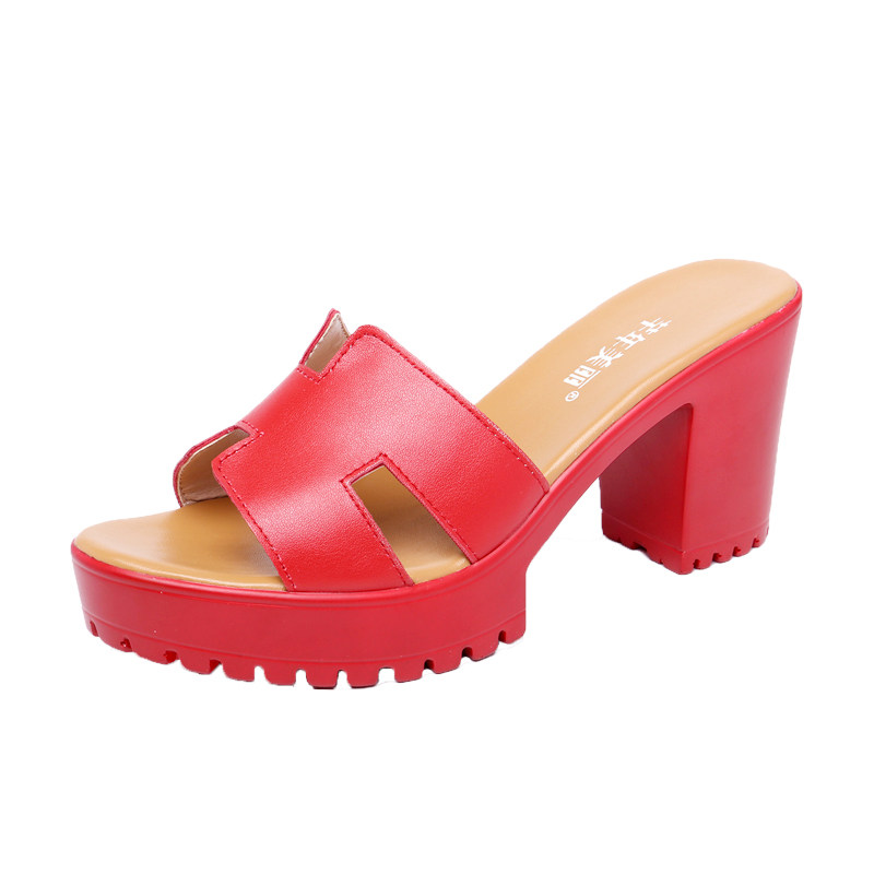 Medium heel thick heel slippers women's summer thick bottom waterproof table leather fashion outside wear word drag large size 40-43 cool slippers