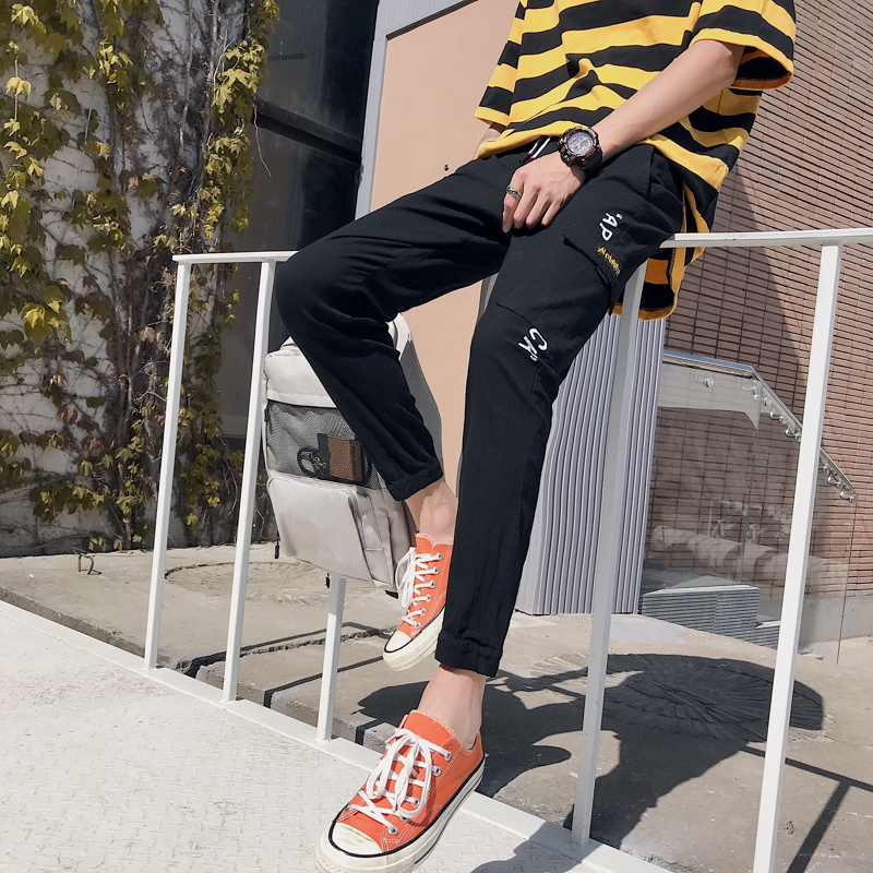 Summer black pants male Korean version trendy 100 hitch foot workout sports Leisure 9 90% Fitted Pants Male Tide Cards