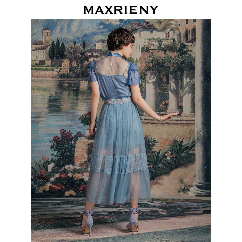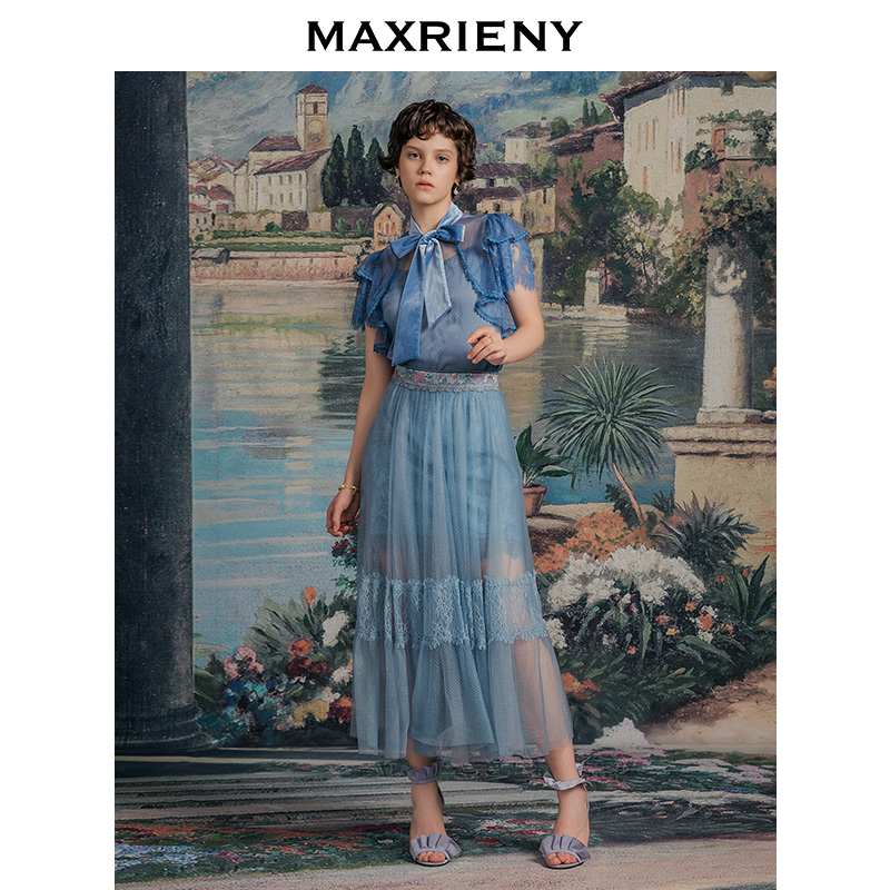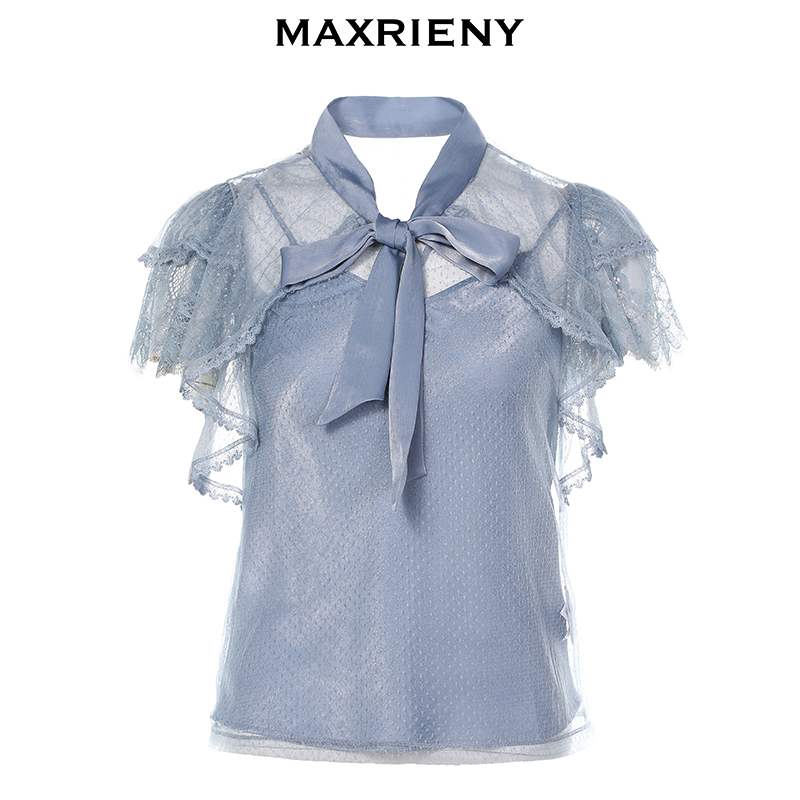 MAXRIENY summer new temperament mesh ruffle short-sleeved lace shirt women's slim hollow lace top fairy