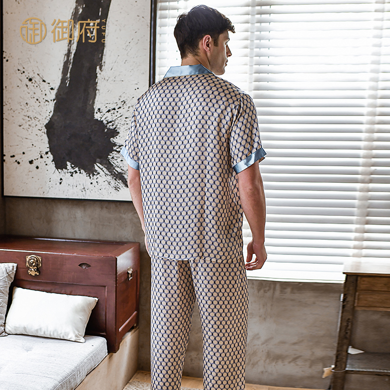 Yufu summer men's silk pajamas short-sleeved two-piece suit 100% mulberry silk pajamas polka dot silk loungewear