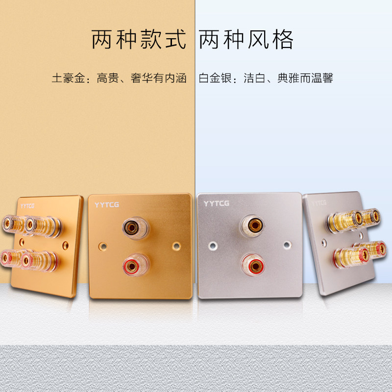 A piece of gold (two-banana binding post) a piece of gold (four banana binding posts) a silver (two-place banana binding post) a piece of silver (four banana binding posts)