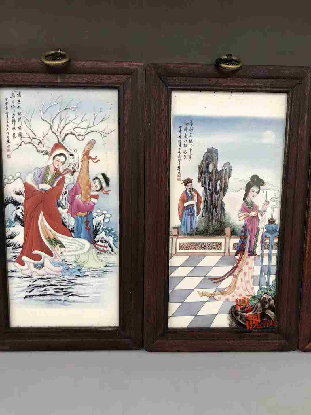 Antique Ceramic Plate Painting Collection Wang Dafan Works Red Wood Inlaid Porcelain Plate 4 Beauty Stories Four Beauty Stories Four Hanging Screens