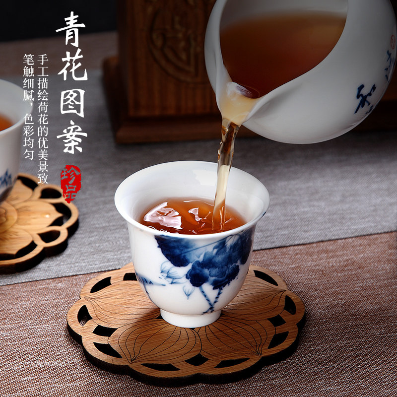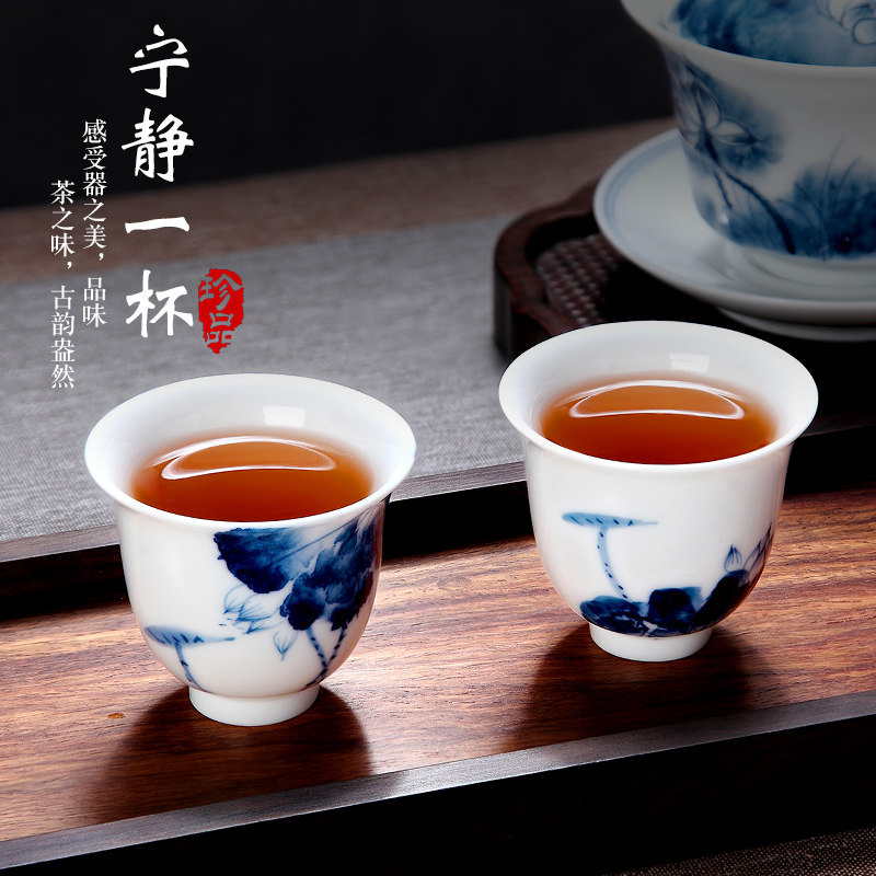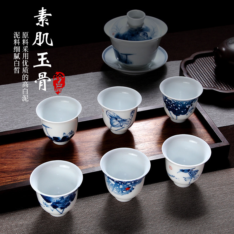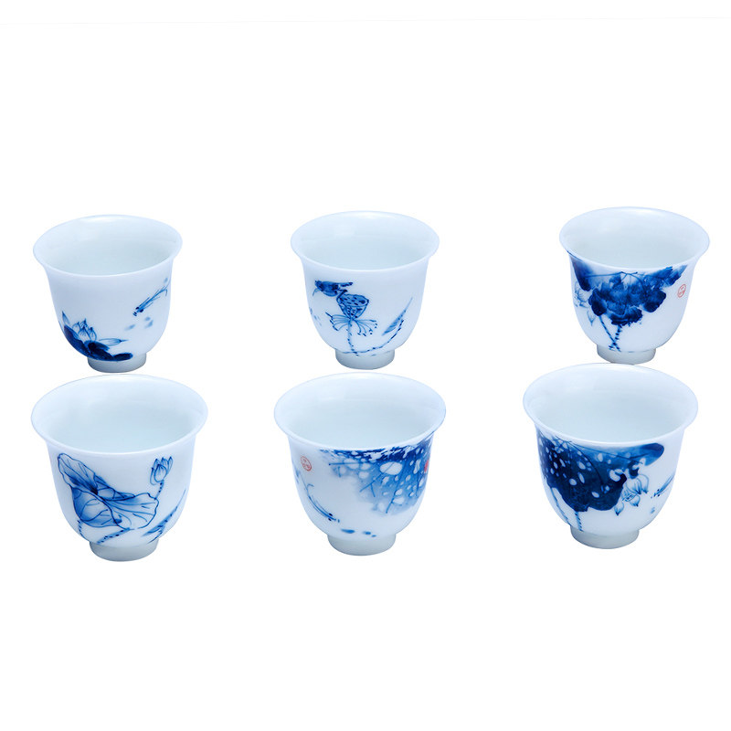 Tang Shun hand-painted lotus six scenes kung fu small tea cup household ceramic underglaze color kung fu tea cup personal tall cup
