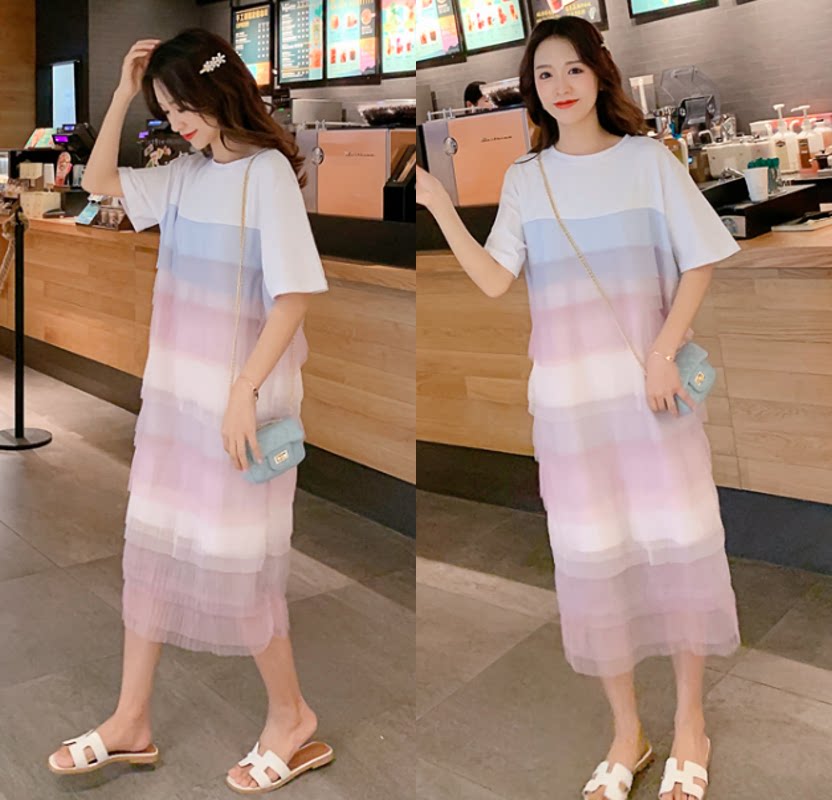 Pregnant woman summer dress Korean style fairy skirt snowspin skirt summer large short sleeves over knee long skirt