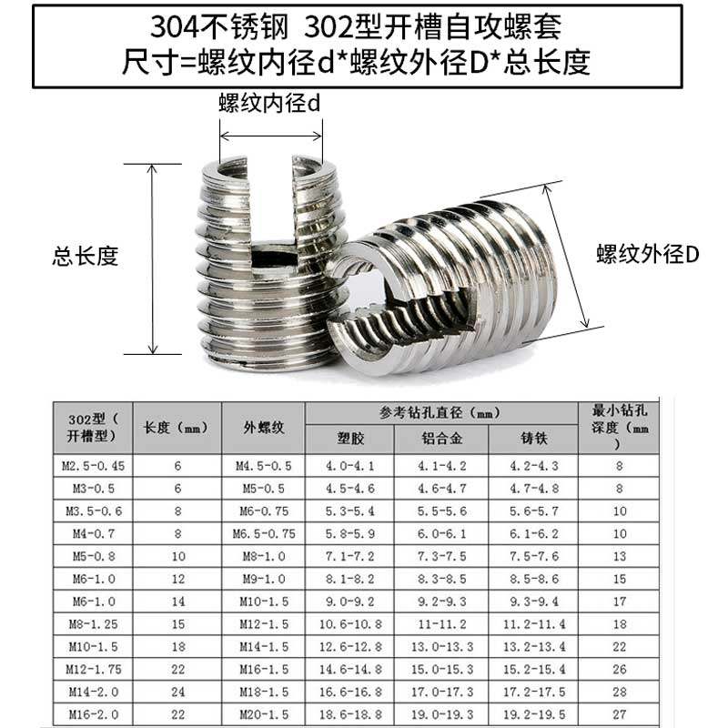 Stainless steel 302 notched type self-tapping screw sleeve