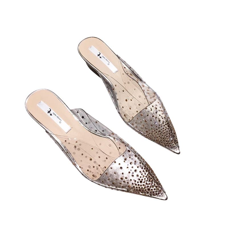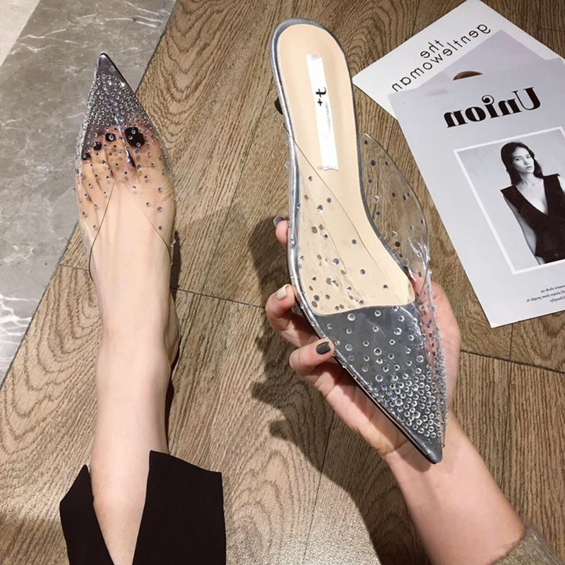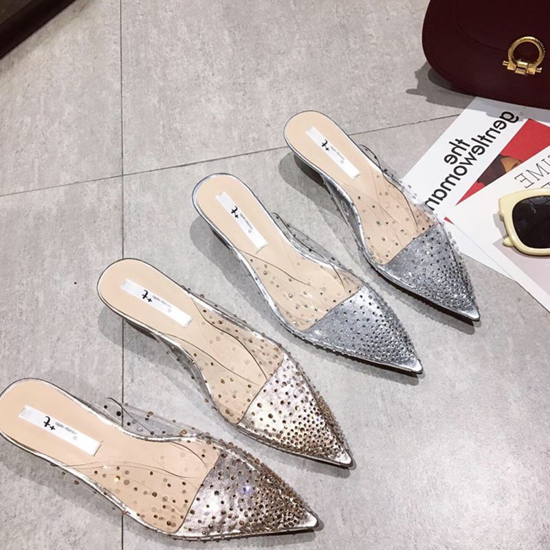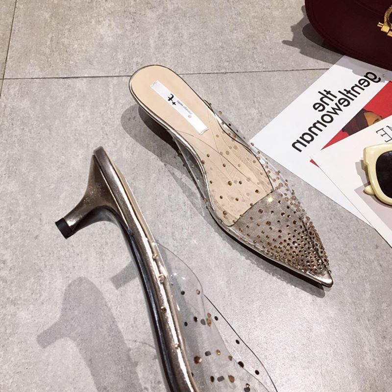 Hong Kong Tide brand net red rhinestone Baotou high-heeled slippers women 2021 summer bohemian pointed word slipper
