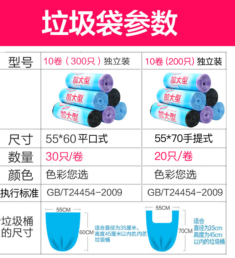 Black, 10 rolls, 300 flat-mouthed, thickened, independent packs 55*60CM, blue 10 rolls, 300 flat-mouthed, thickened, single-packs, 55*60CM, purple 10