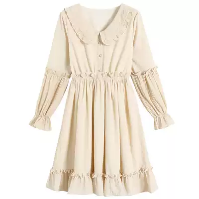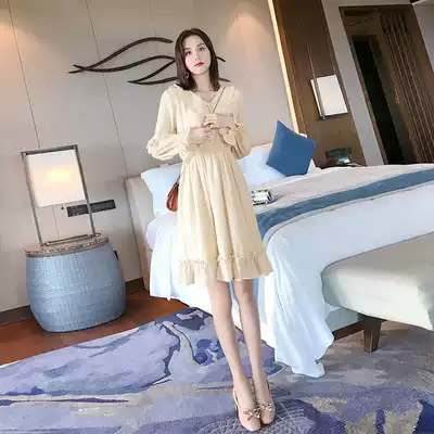 European station net red wind 2021 autumn new dress women Korean fashion women solid color vneck long sleeve pleated skirt