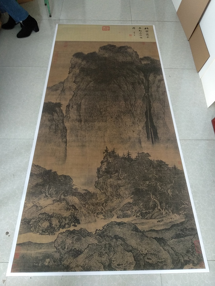 Song Dynasty landscape painting Fan Kuanxi Mountain travel map Antique painting Micro spray copy painting Silk painting Copy manuscript Decorative painting