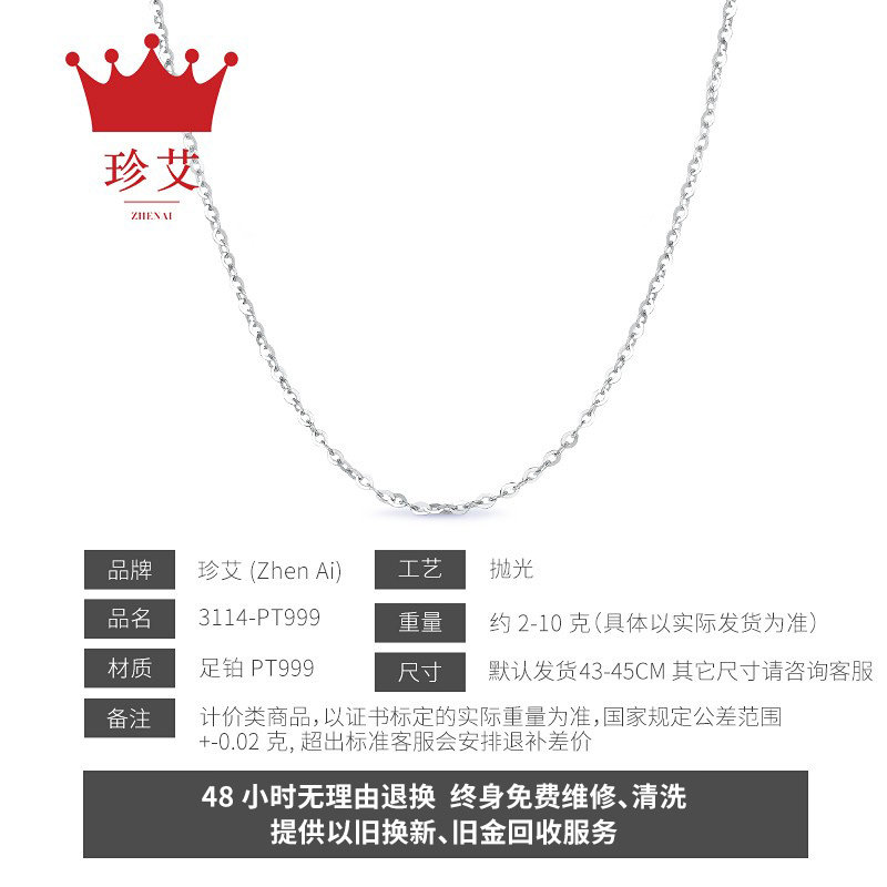 PT999 Platinum 3.21g (43cm) PT999 Platinum 3.33g (45cm) PT999 Platinum 4.88g (42cm) PT999 Platinum 4.22g (45cm) PT999 Platinum 5.16g (45cm) PT999 Platinum 5.54g (47cm) PT999 Platinum 6.52g (45cm) PT999 Platinum 6.53g (48cm) PT999 Platinum 7.81g (44cm) PT999 Platinum 7.00 g (48 cm) PT999 Platinum 8.43 g (45 cm) PT999 Platinum 8.93 g (48 cm) PT999 Platinum 9.90 g (47 cm) PT999 Platinum 9.29 g (50 cm) PT999 Platinum 10.93 g (52 cm) PT999 Platinum 11.76 g (52 cm) PT999 Platinum 11.49 g (55 cm) PT999 Platinum 13.19 g (53 cm) More gram size can consult customer service, gram weight to actually issue more refund and less compensation