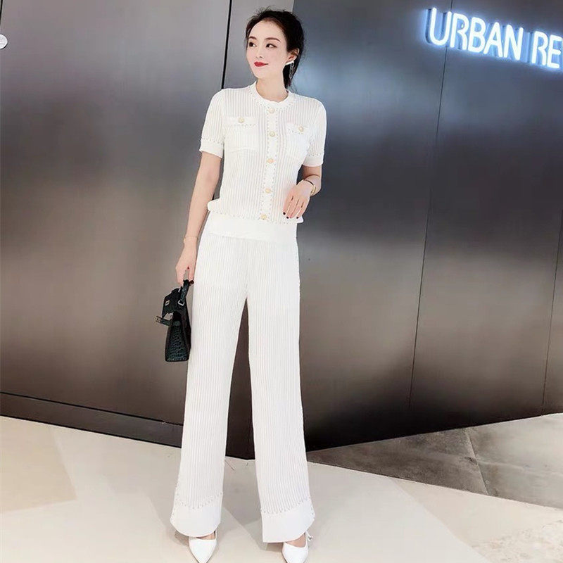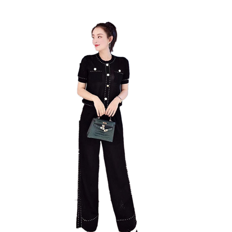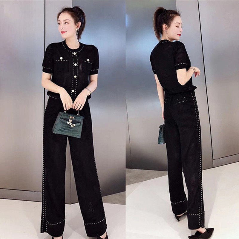 Ice silk knitted suit women's 2022 summer new style light and familiar style thin hollow short-sleeved wide-leg pants two-piece set