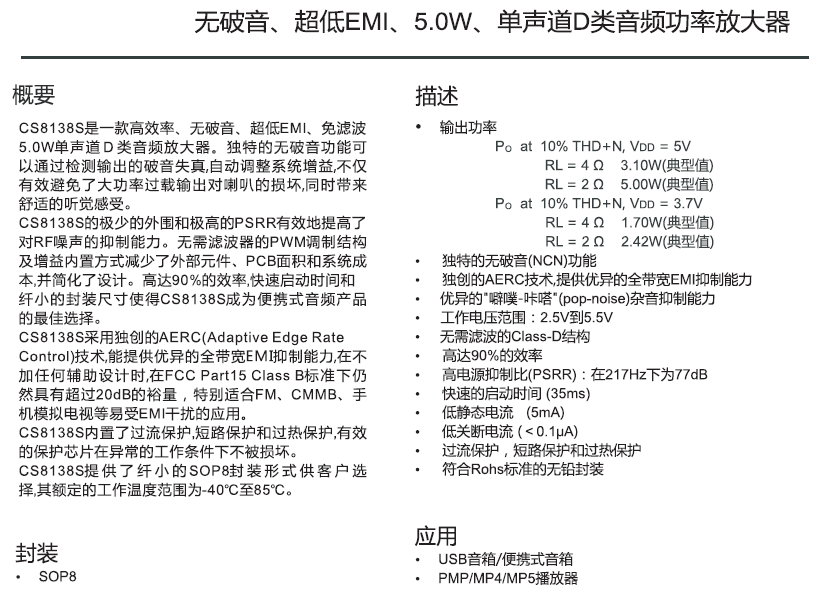 Brand new original audio chip IC CS8138S Class D 5W with anti-distortion patch SOP8