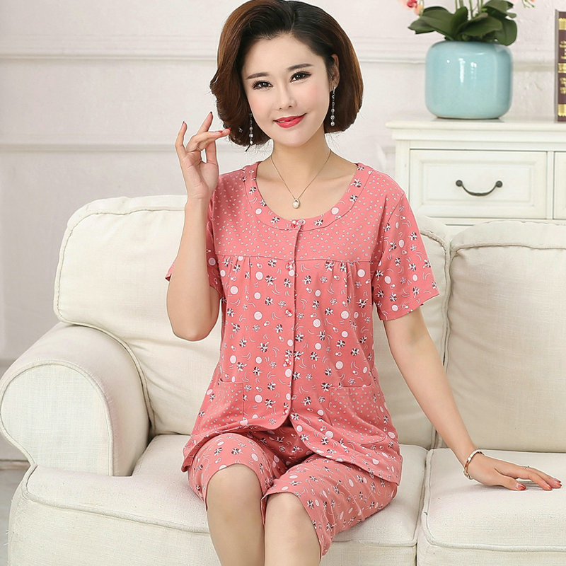 Middle-aged and elderly mother's pajamas female summer cotton short-sleeved thin two-piece suit round neck open chest mother-in-law grandma home clothes