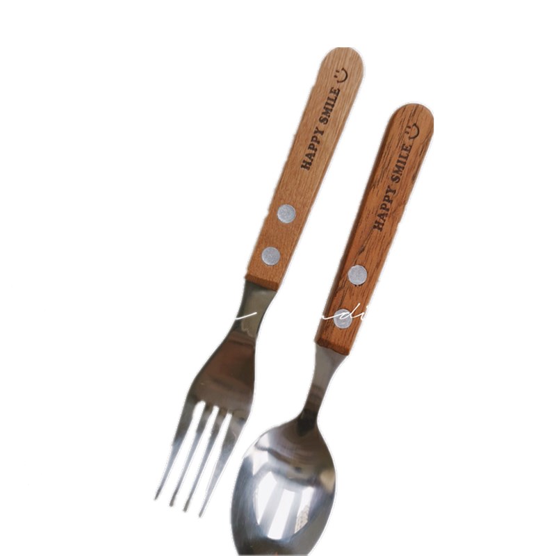 Spot Japan Import Day Style Wood Handle Meta Gas Smiley Face Stainless Steel Positive Meal Spoon Fork Knife Coffee Spoon Dessert Fork Smear Knife