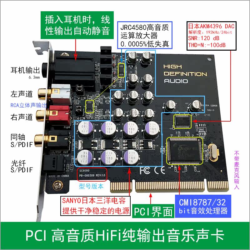 PCI-E 7 1 sound card motherboard PCI 8 channel fiber coaxial support win XP 7 8 10 11