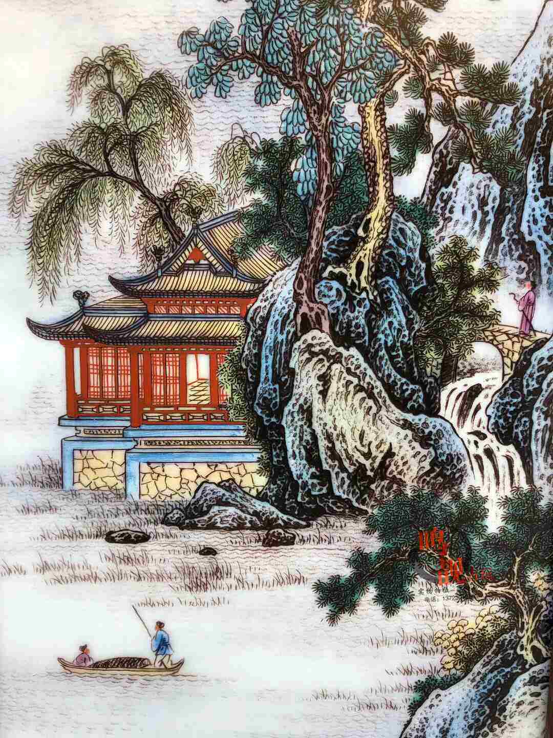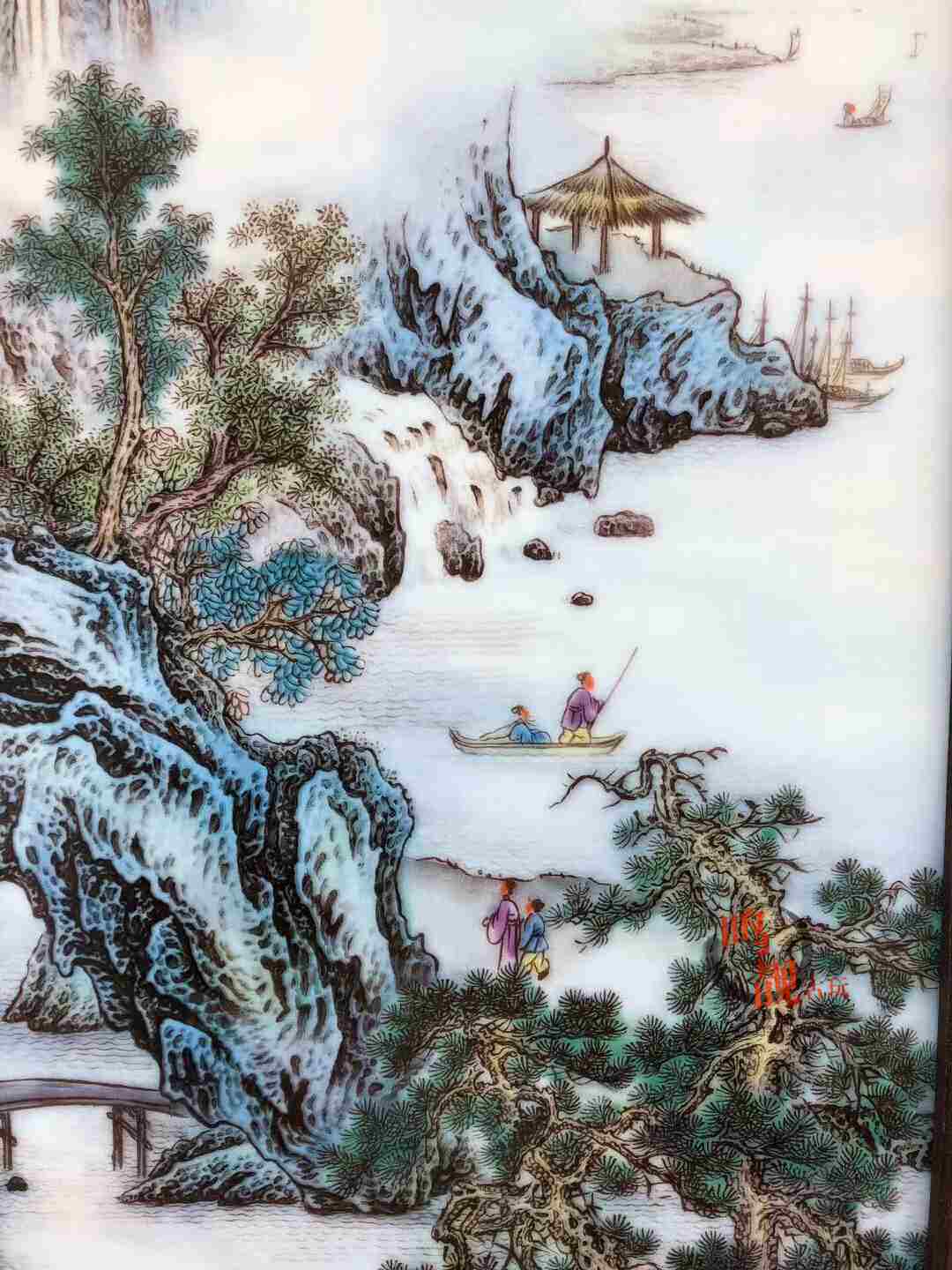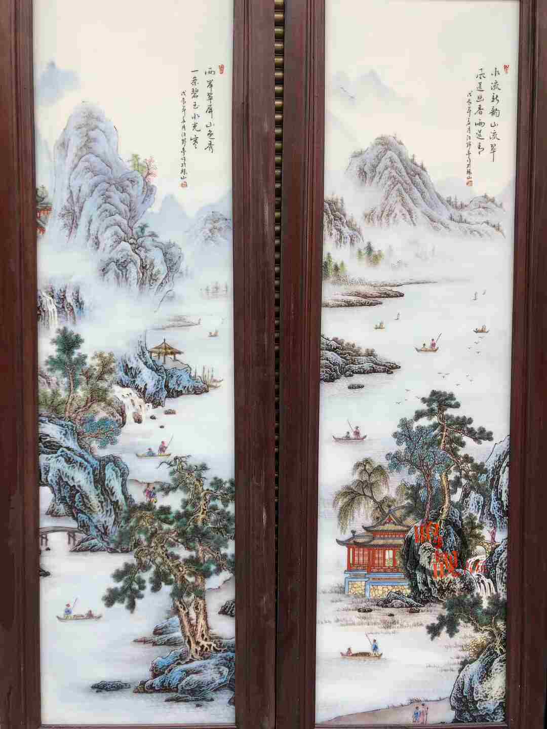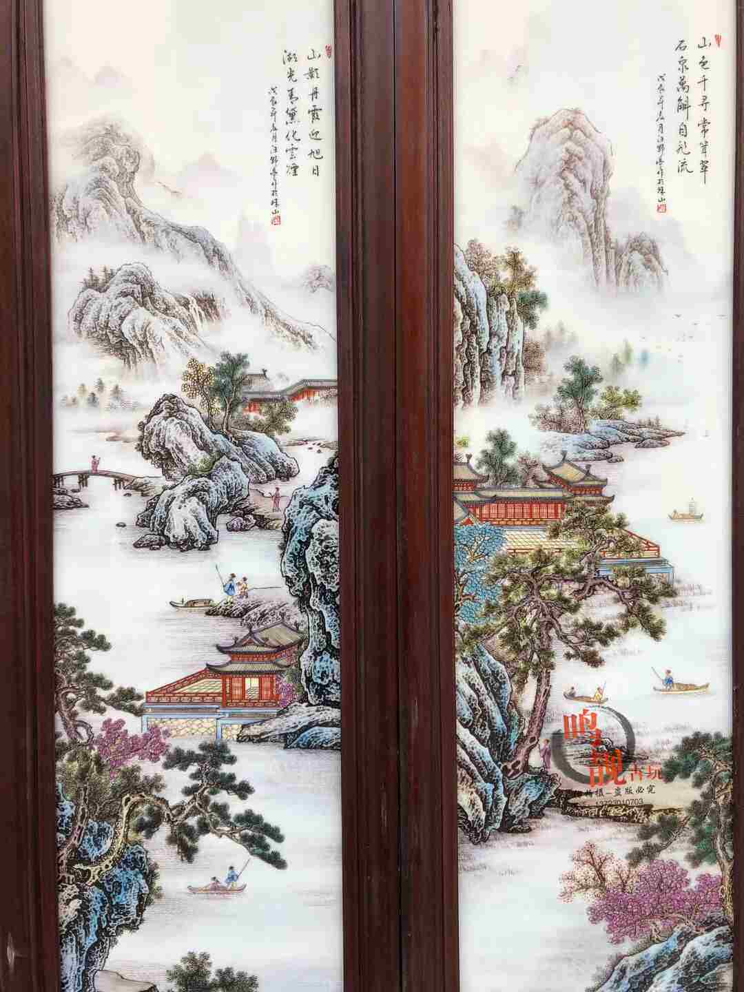 Antique Ceramic Plate Painting Collection of Collection Pink Camping Master Works Red Wood Inlaid Porcelain Plate Painting Pink Landscape hanging screen