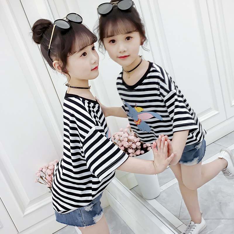 Girls Short Sleeve T-shirt Summer Loose Strip Top Children's Fat Shirt Cutty Cartoon Elephant Half-sleeved Sweater