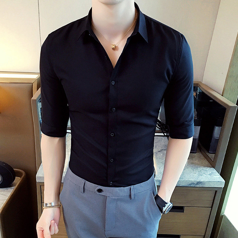 Ruffian handsome shirt men's summer seven-point sleeve ultra-thin Hong Kong trend men's net red shirt five-point sleeve ice silk Chiffon elastic
