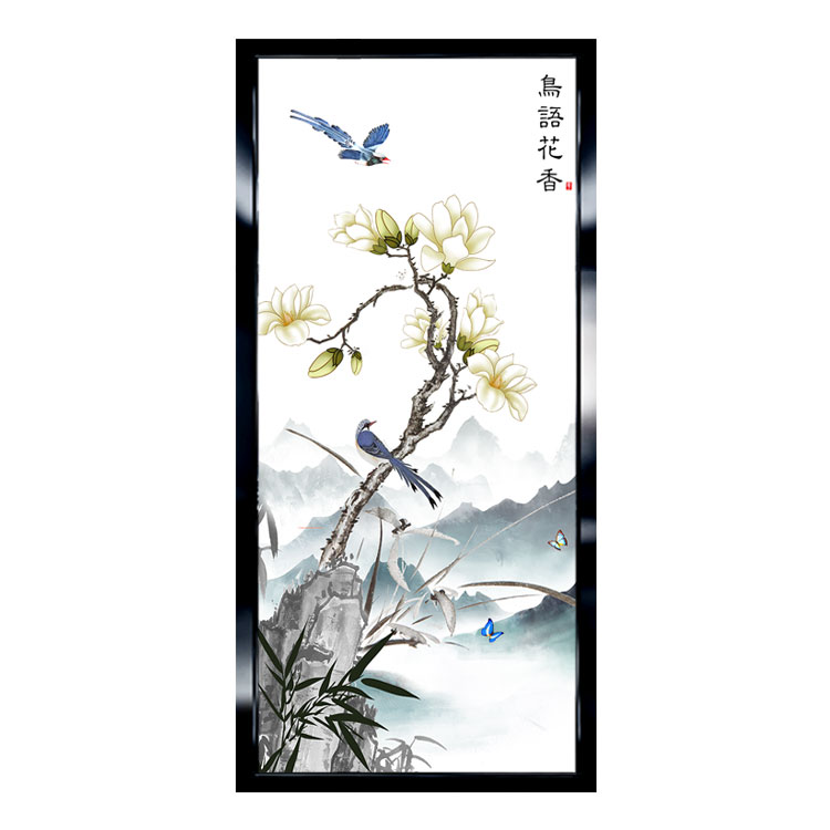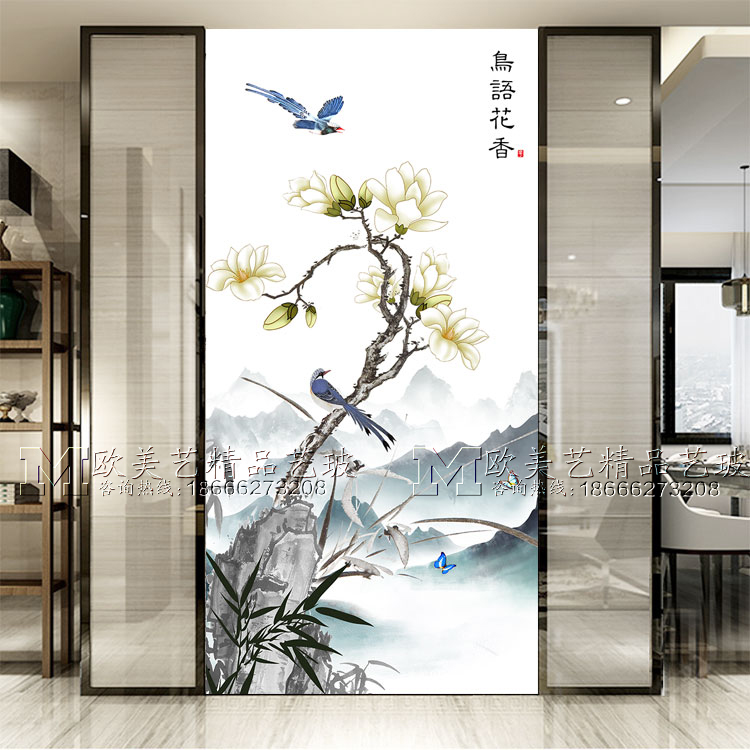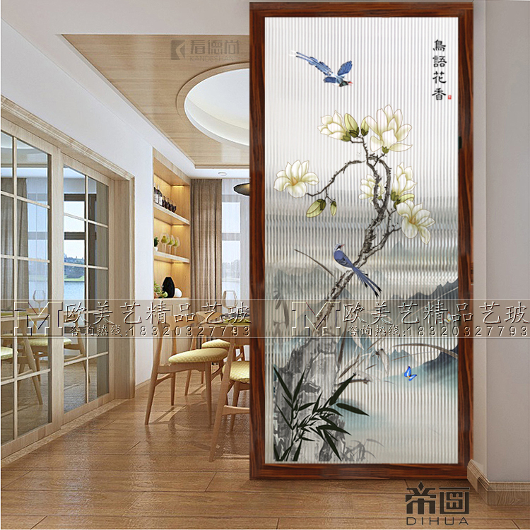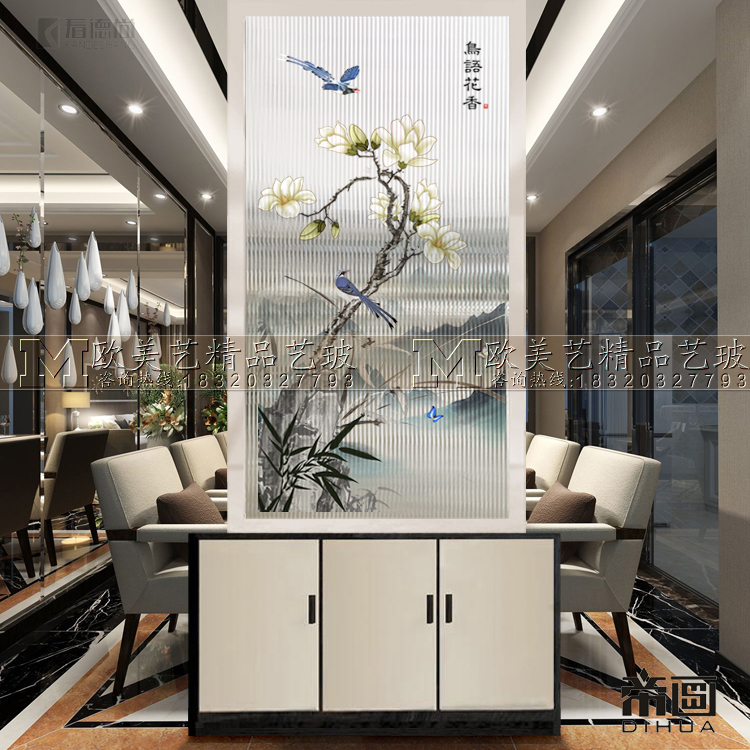 Art Changhong glass partition wall frosted transparent screen living room entrance background modern landscape painting flowers and birds customized