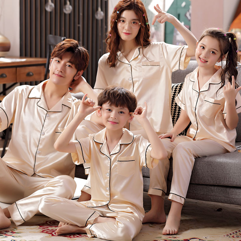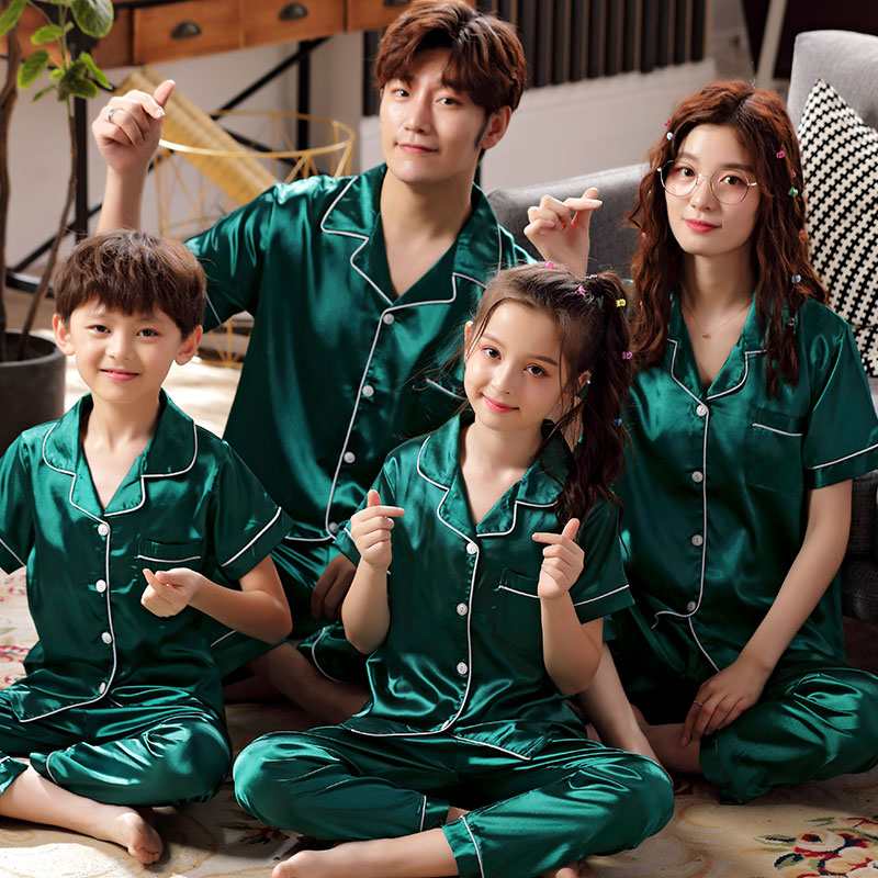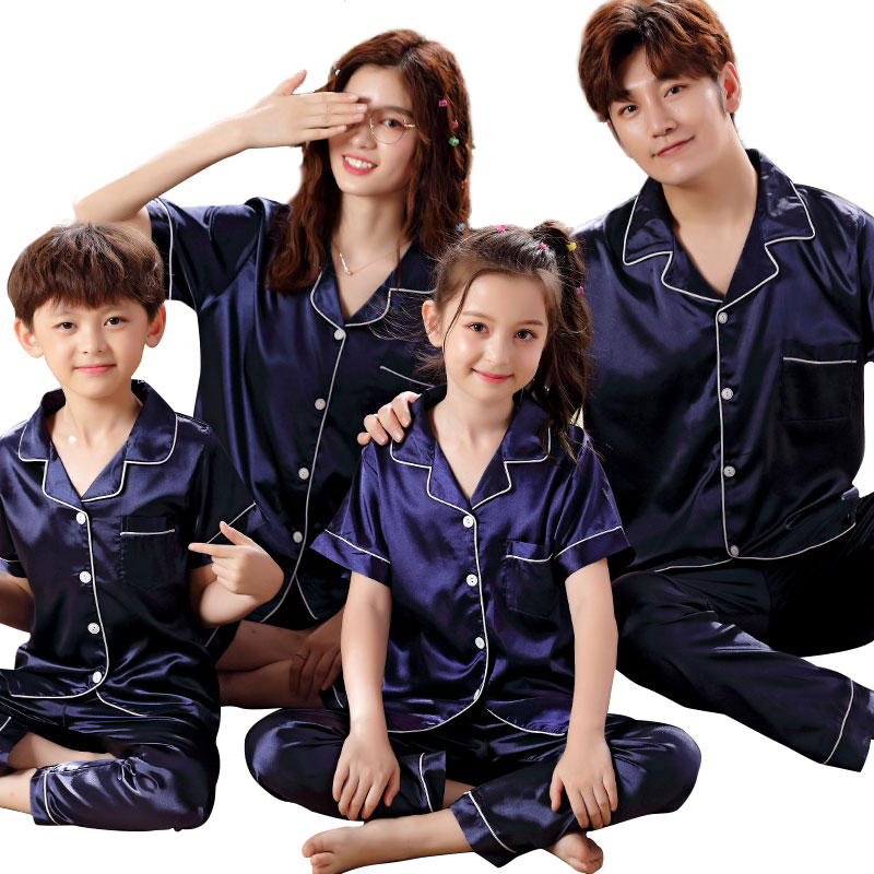 Parent-child Sleepwear Summer Family of Three Mouthed Ice Silk Thin summer Short sleeves Male CUHK Tong Silk Mother's Family Guy