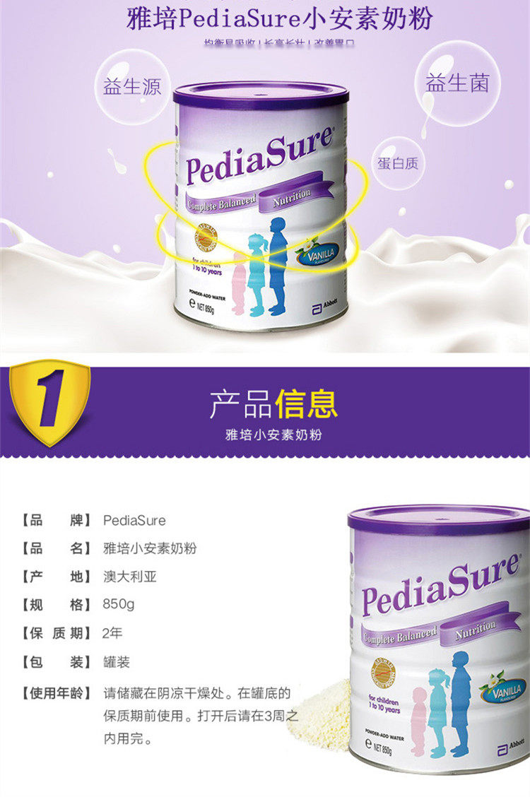 Australia's PediaSure Abbott Xiao Ansu children's milk powder helps children aged 1-10 grow taller 850g