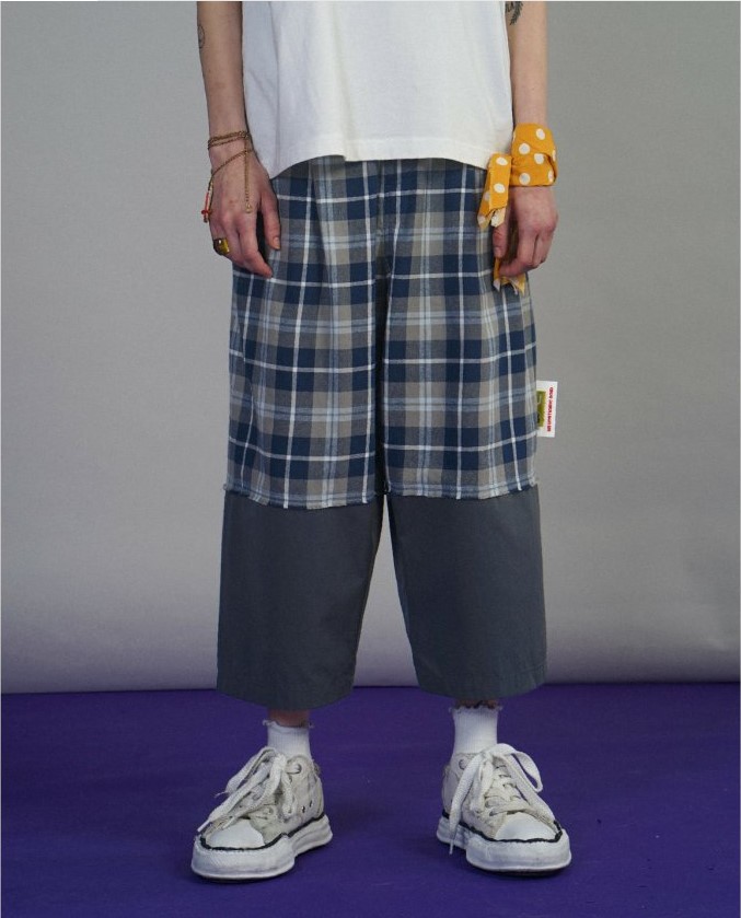 UNVESNO 19SS retro grid lattice false two spliced summer thin straight cylinder casual 90% pants