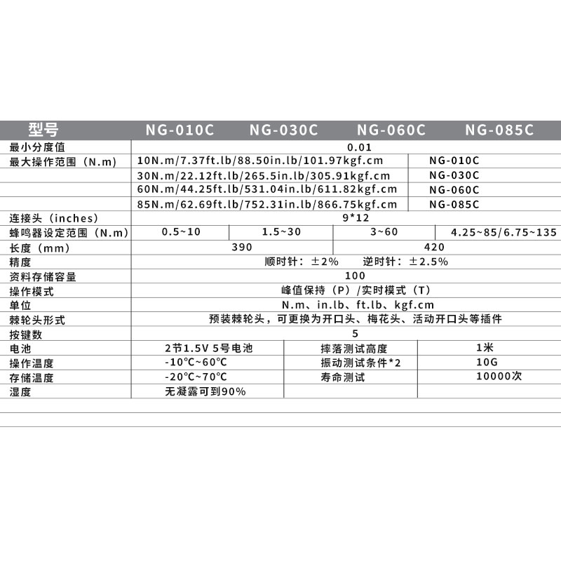 NG-30 1 4”1 5-30N m Accuracy±2% Indexing value 0 01 With communication NG-30C Interchangeable head 9*12”1 5-30N