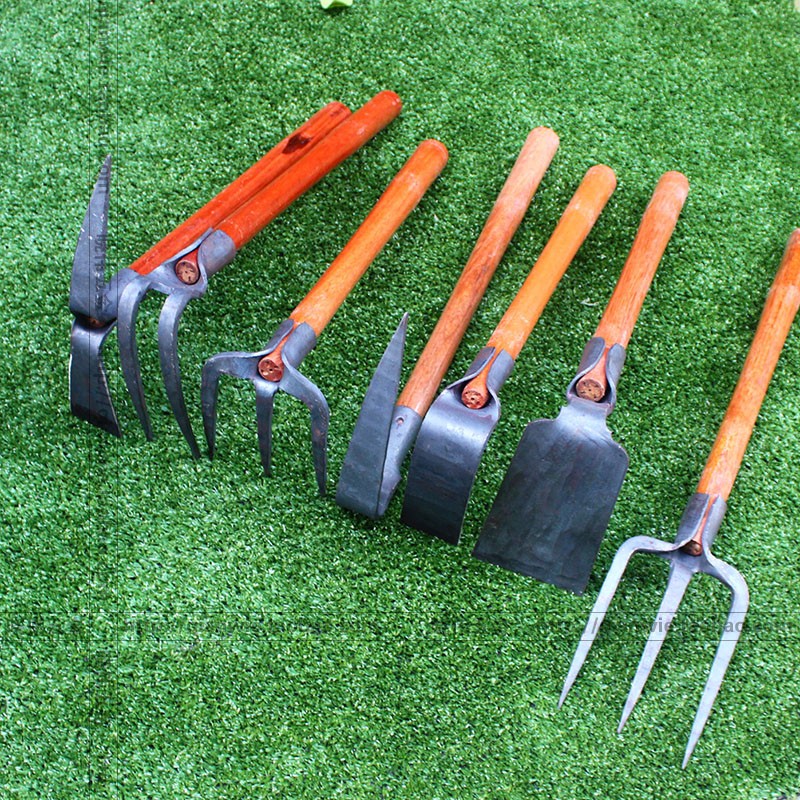 Old blacksmith forged small hoe Garden flower hoe Agricultural vegetable hoe two-tooth hoe wooden handle three-tooth hoe