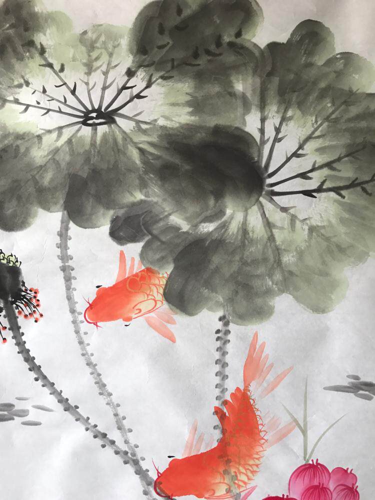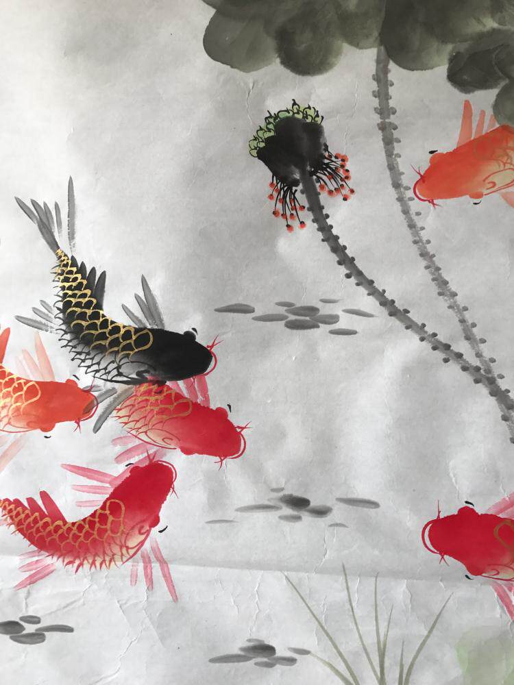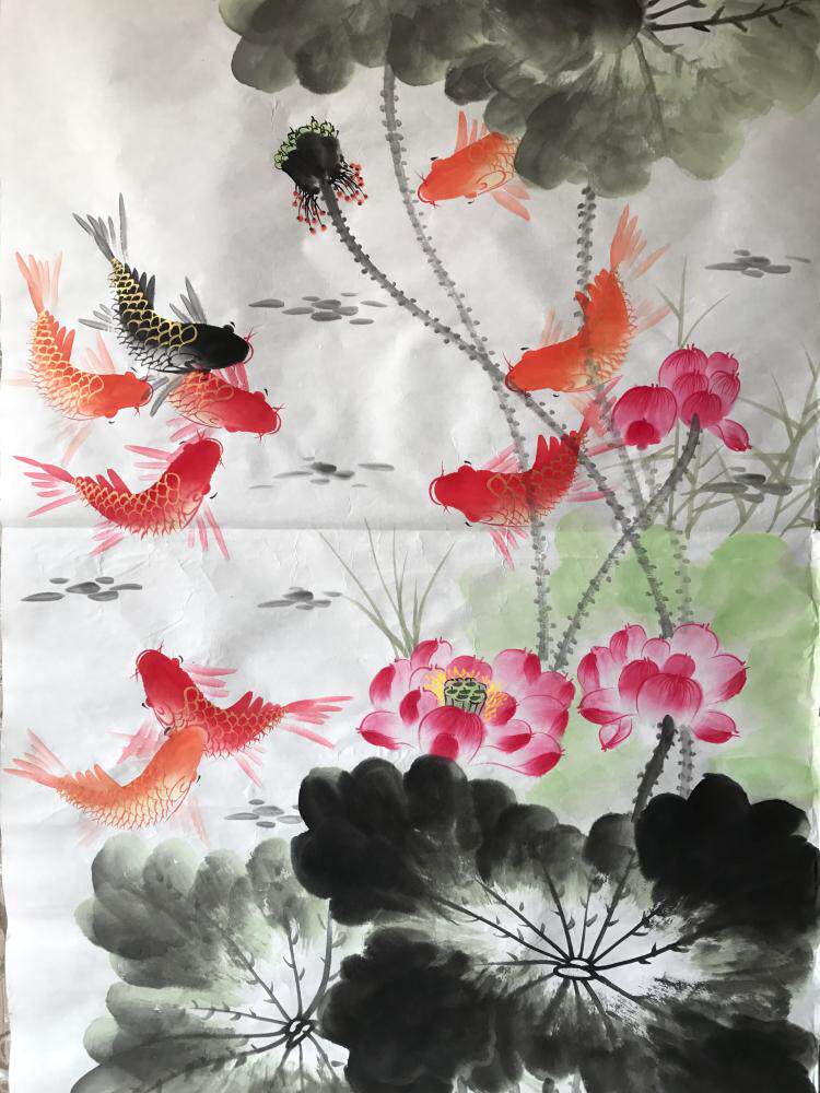 Lotus Nine Fish Diagram Feng Shui Chinese Painting Ink Freehand Flower and Bird Character Painting Pure Hand-Painted Living Room Office Decoration Painting