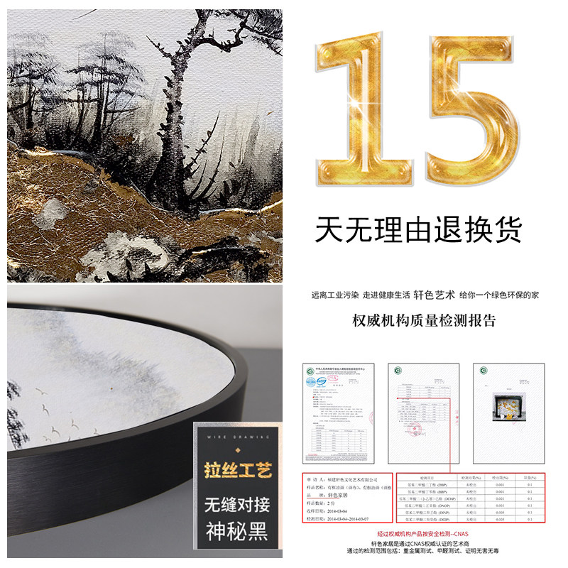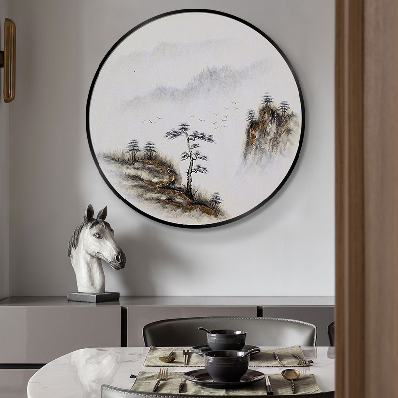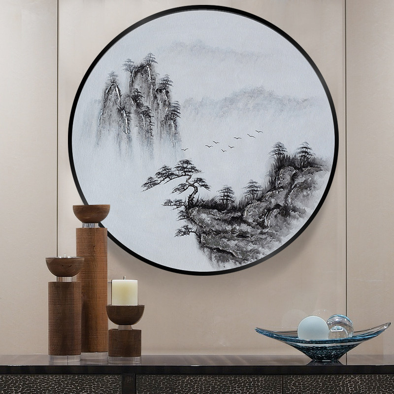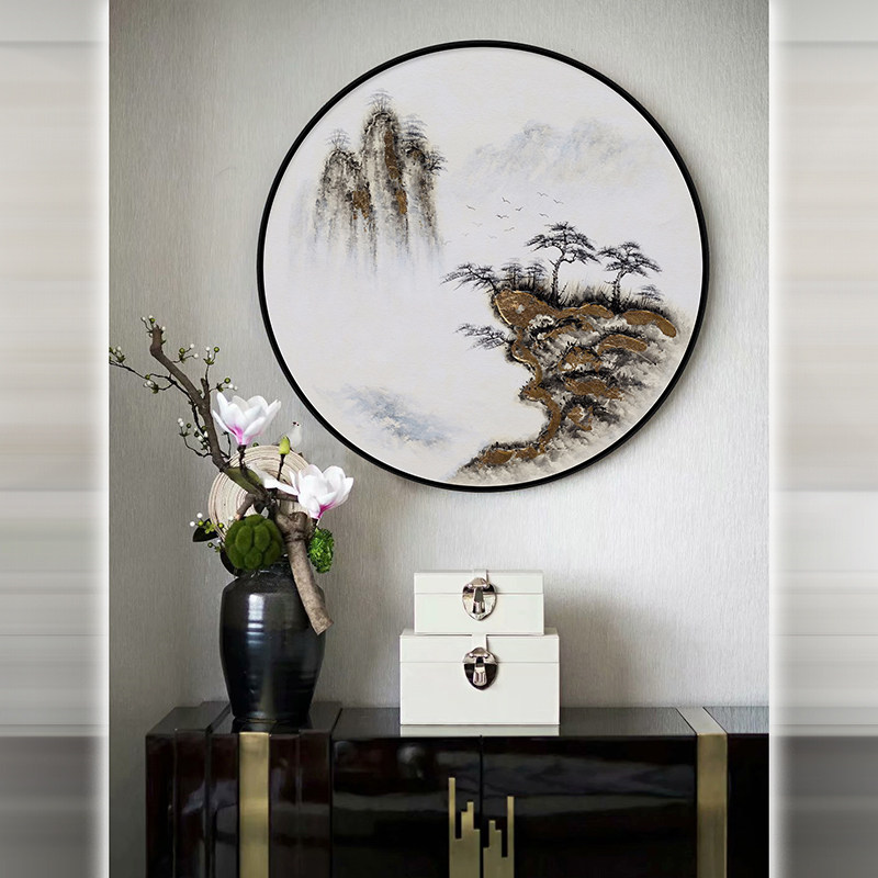 Hand-painted oil painting Chinese style Zen landscape painting porch decorative painting study living room hanging painting simple solid wood round mural