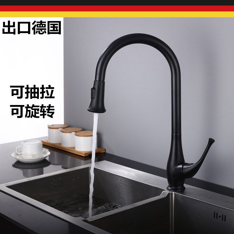 All copper modern black kitchen faucet wash pot can pull sink cool and hot water ceramic single hole rotating valve core