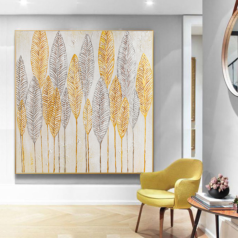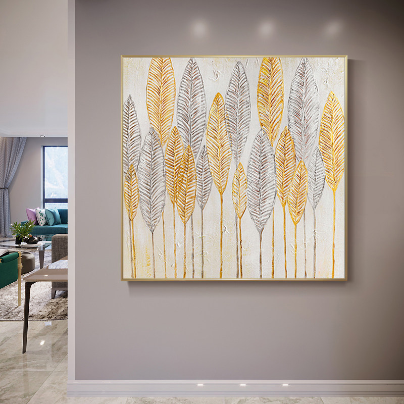 Living Room Xuanguan Sofa Hotel Lobby Dining Room Pure Hand-painted Oil Painting Atmosphere Gold Leaf Painting Leaves Hanging Painting Giant Mural Painting