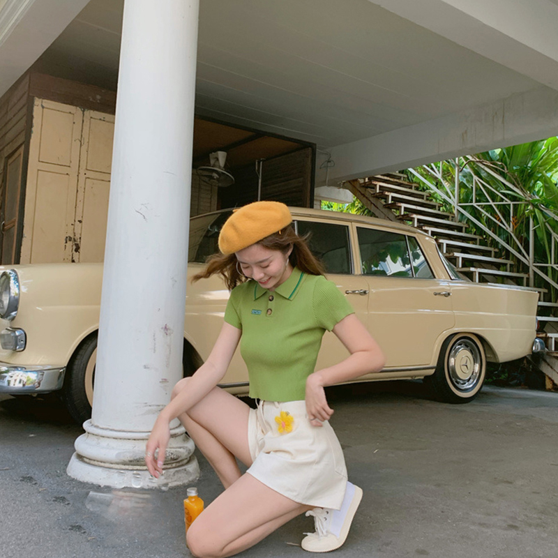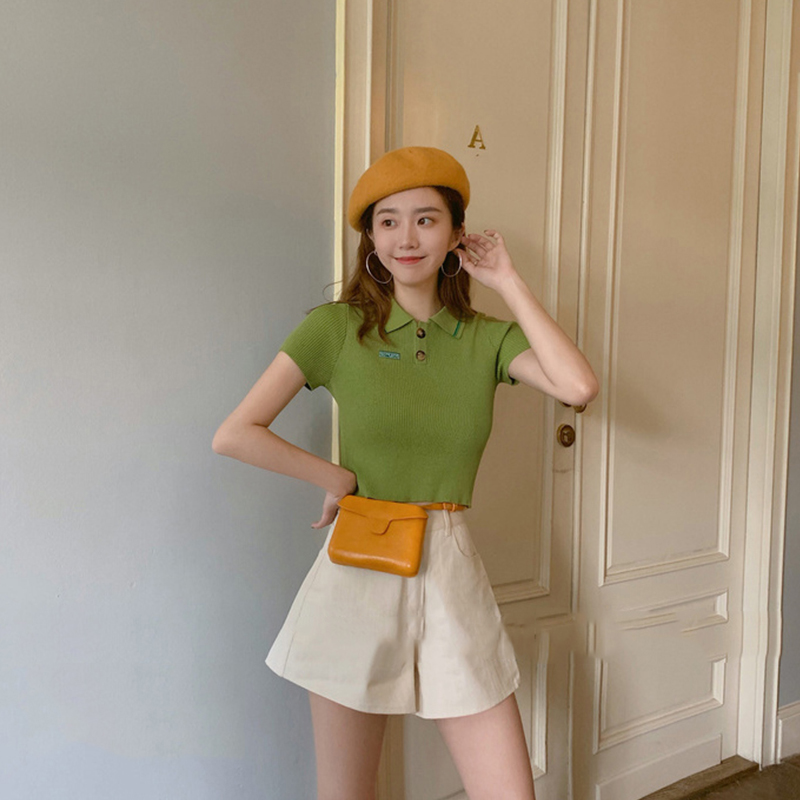 Summer 2021 new polo collar ice silk knit shirt female foreign pie thin avocado green heart machine T-shirt short women