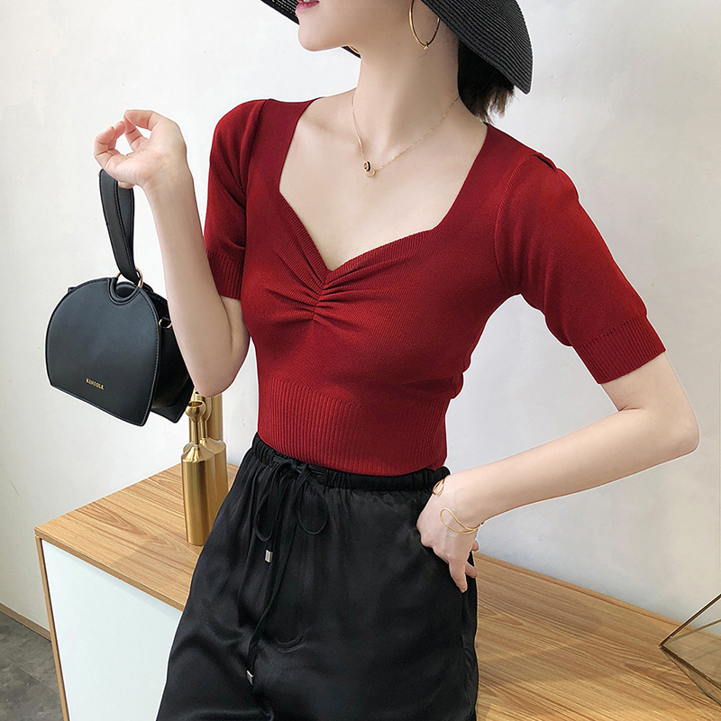 V collar knit double curveball high waist knit short sleeve t-shirt female summer display slim heart machine Sexy dew-cord ice-wire short sleeve blouse