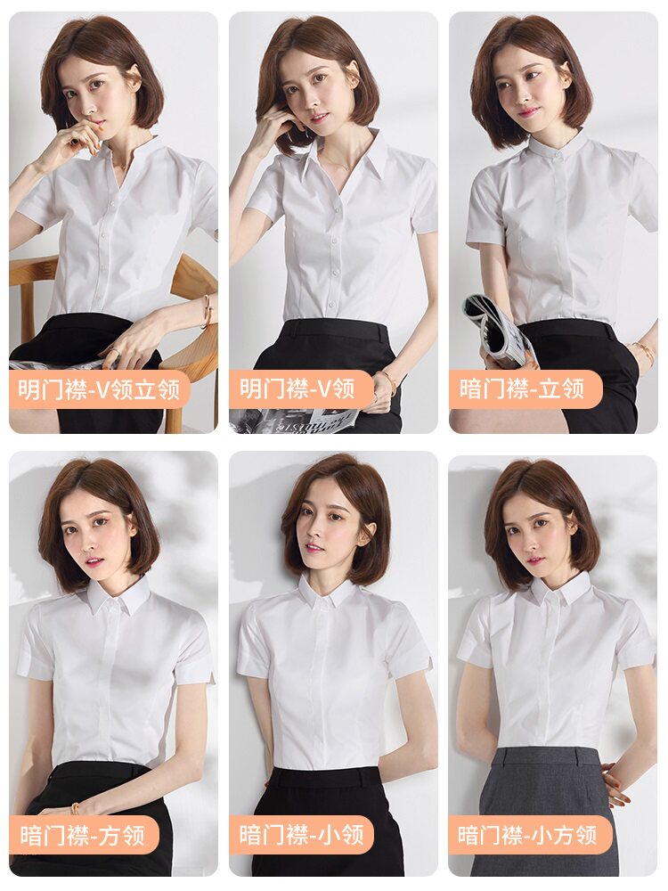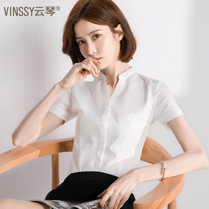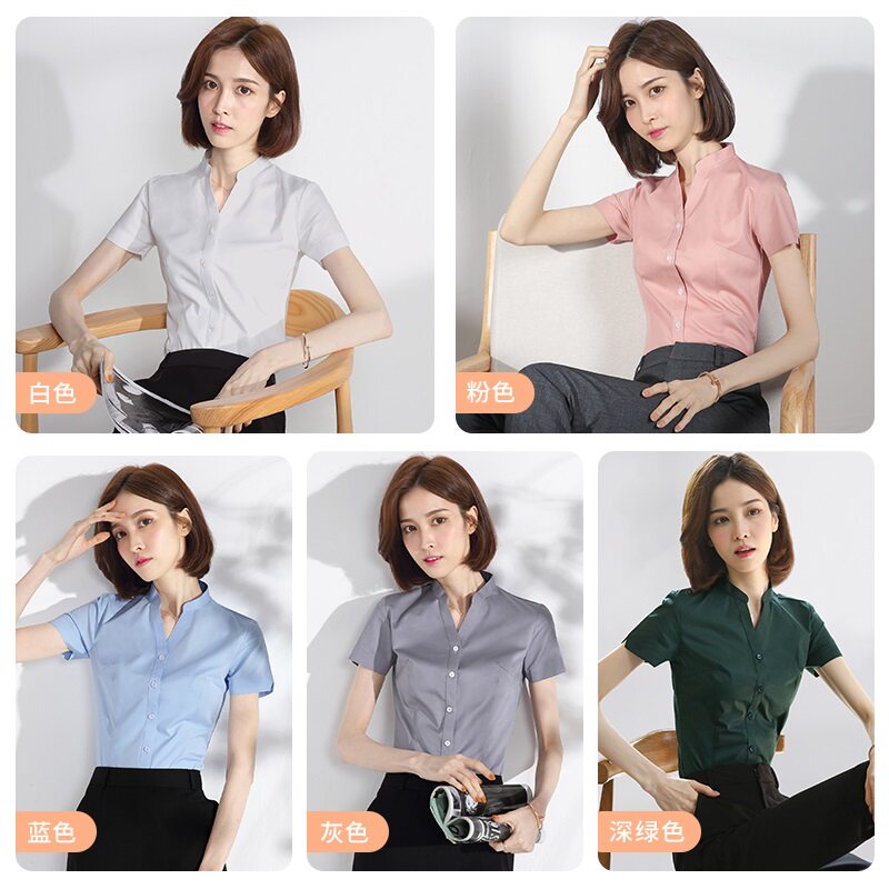 White professional shirt women's short-sleeved V-neck overalls formal stand-up collar tooling shirt 2021 summer free ironing inch clothes