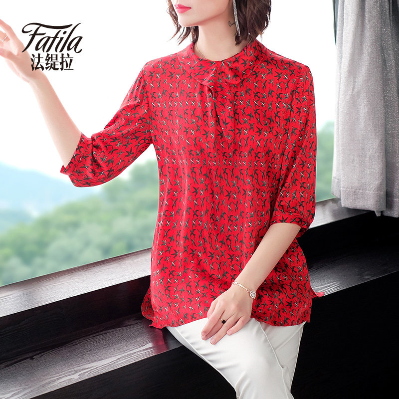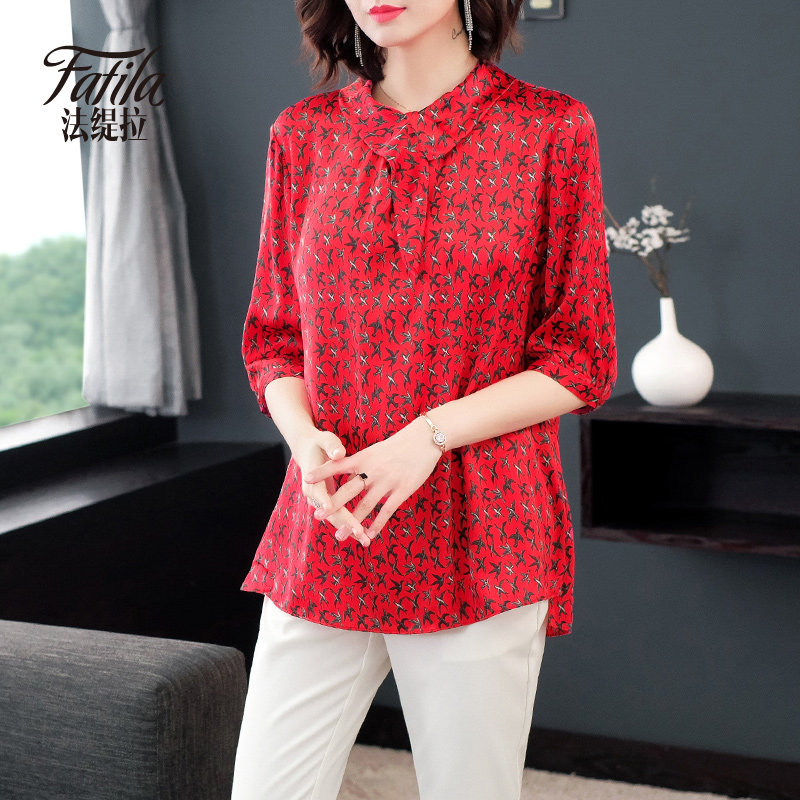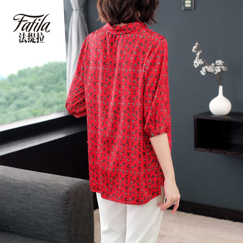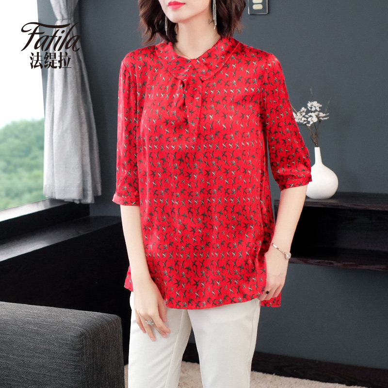 Hangzhou red middle aged mother weighs in real silk blouses female medium long version loose silk satin silk shirt foreign pie