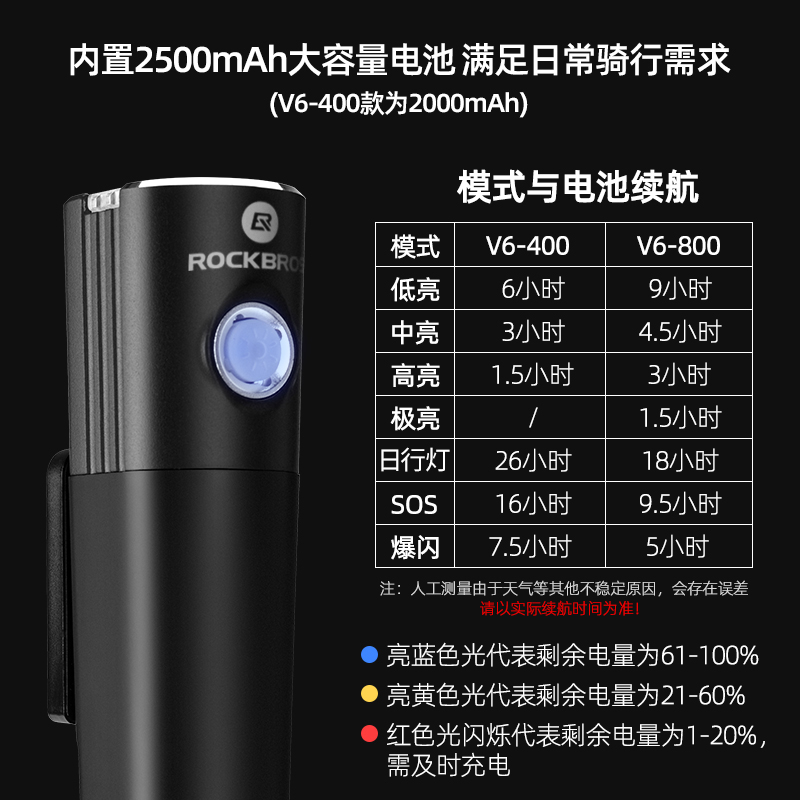 V6-800 (800 lumens, 7 levels of light, 2500mAh) V6-400 (400 lumens, 6 levels of light, 2000mAh)