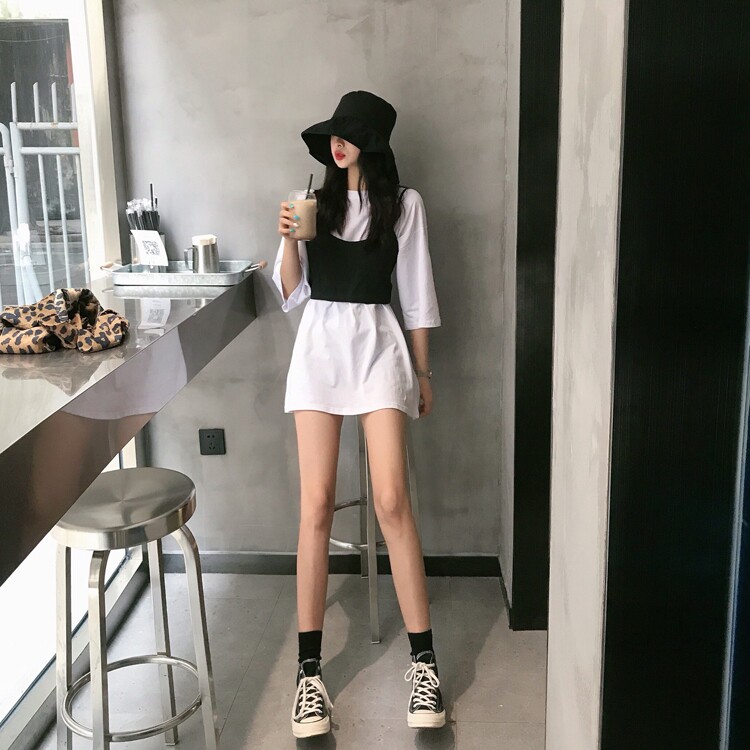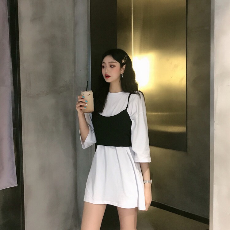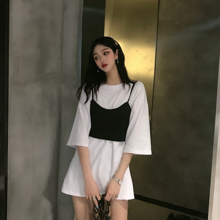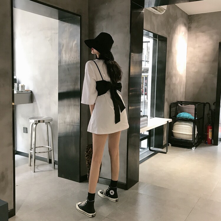 Internet celebrity Hyuna wears white short-sleeved t-shirts before and after, female sense tops, bow tie waist slimming dress