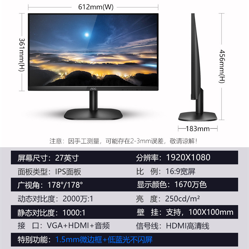 AOC 27B2HM 27 inch monitor IPS HD 1080p screen 75Hz desktop computer LCD home office HDMI external Notebook PS4 support wall hanging