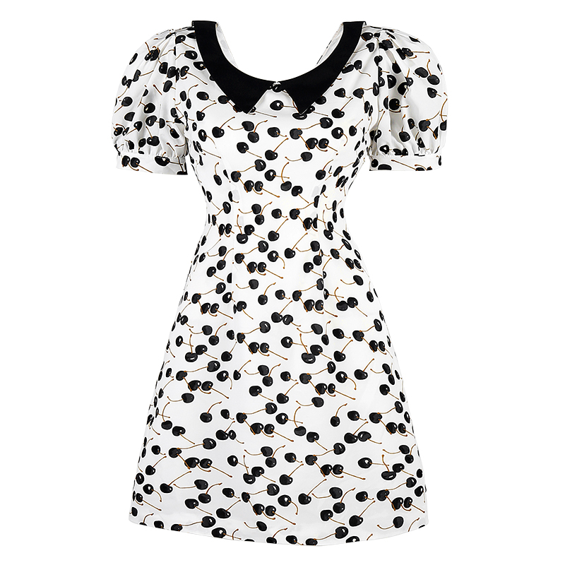 Romantic doll collar White dress Women's Summer point A-line skirt Vintage Hepburn wind high waisted V-neck puff sleeve skirt